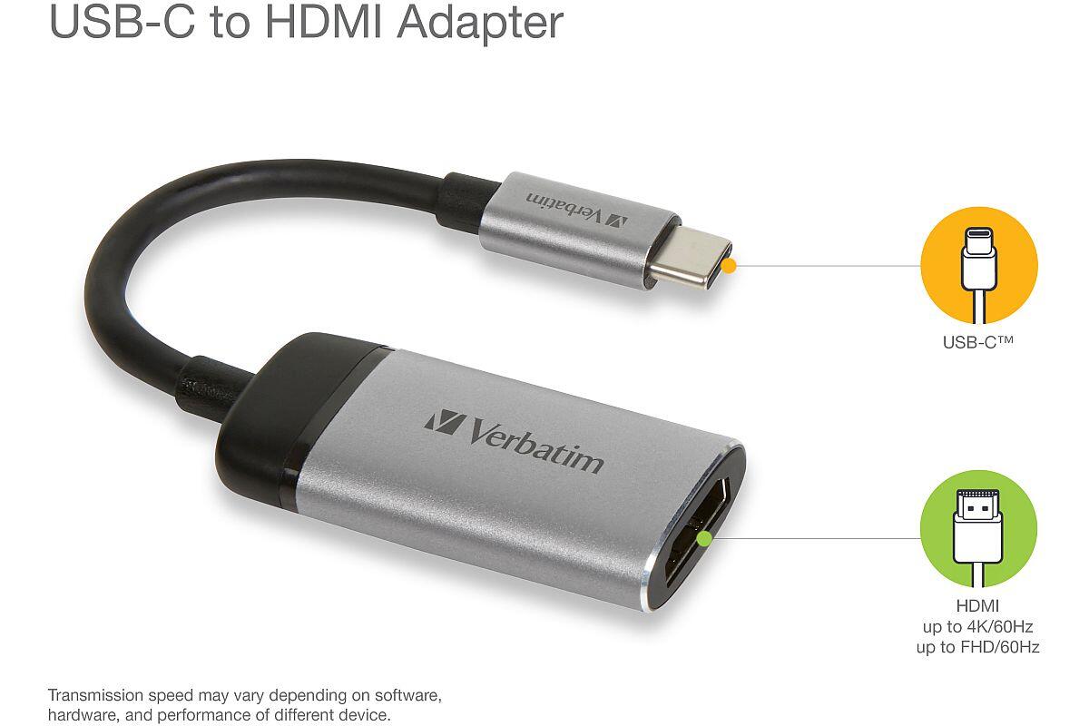 - adaptér Verbatim USB-C™ to HDMI 4K umožňuje připojení chytrých telefonů, notebooků a MacBooků podporujících standard USB-C nebo Thunderbolt 3 (USB-C) k projektoru, HDTV nebo monitoru, který podporuje HDMI
