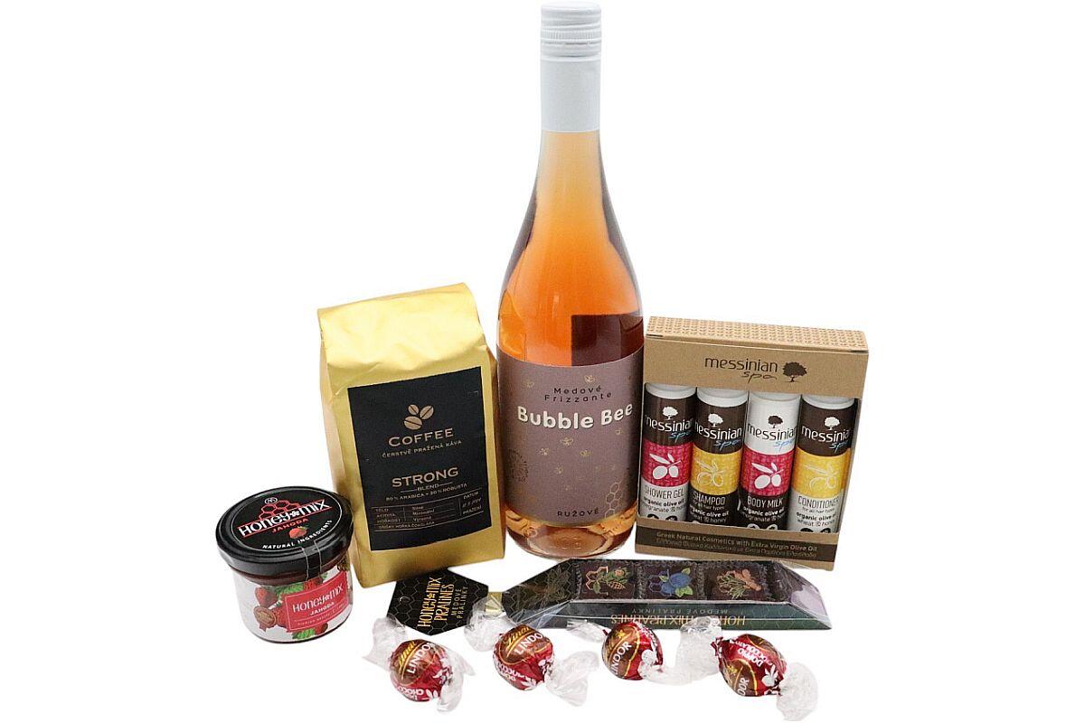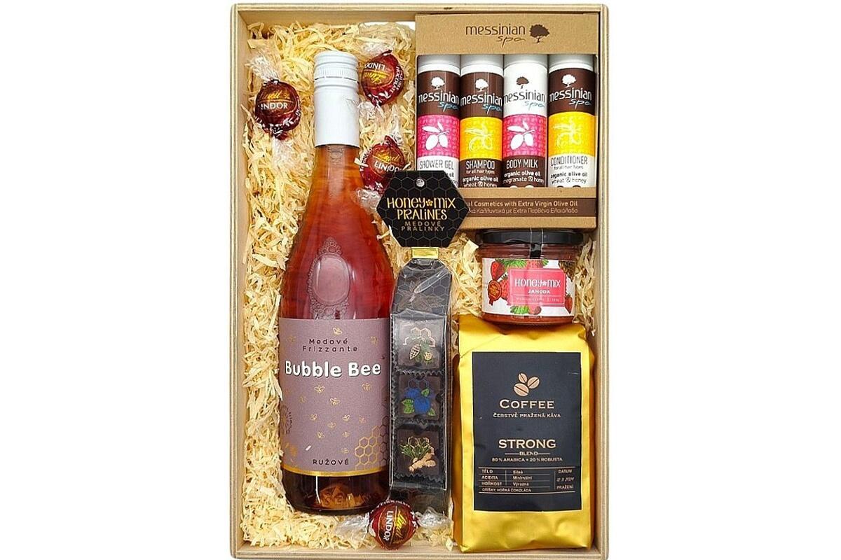 - dřevěná bedýnka v kombinaci gurmánských pochoutek a luxusní péče o tělo