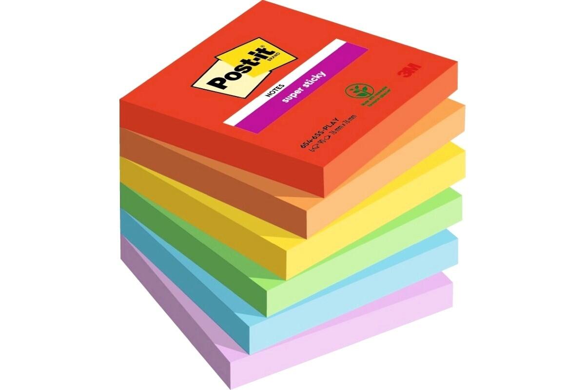 Bloček samolepící 3M Post-it Super Sticky, 76 x 76 mm, Playful, 6 x 90 lístků, barevný mix