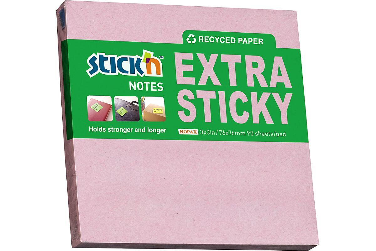 Bloček samolepicí Stick'n by Hopax EXTRA STICKY, 76 x 76 mm, recyklovaný, 90 lístků, růžový