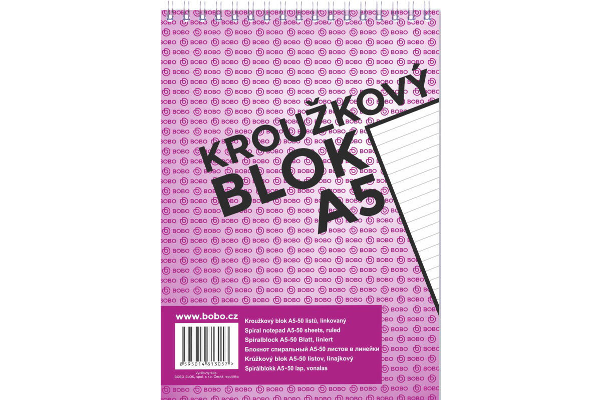 Blok A5 s horní spirálou Bobo, linkovaný, 50 listů