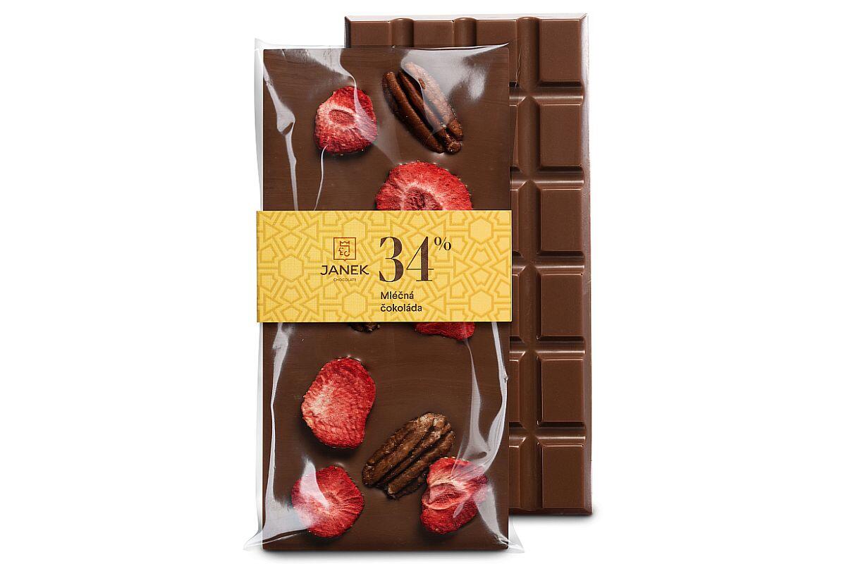 | 1913674 | Čokoláda mléčná Janek, S pekanovými ořechy a lyofilizovanými jahodami, 95 g |