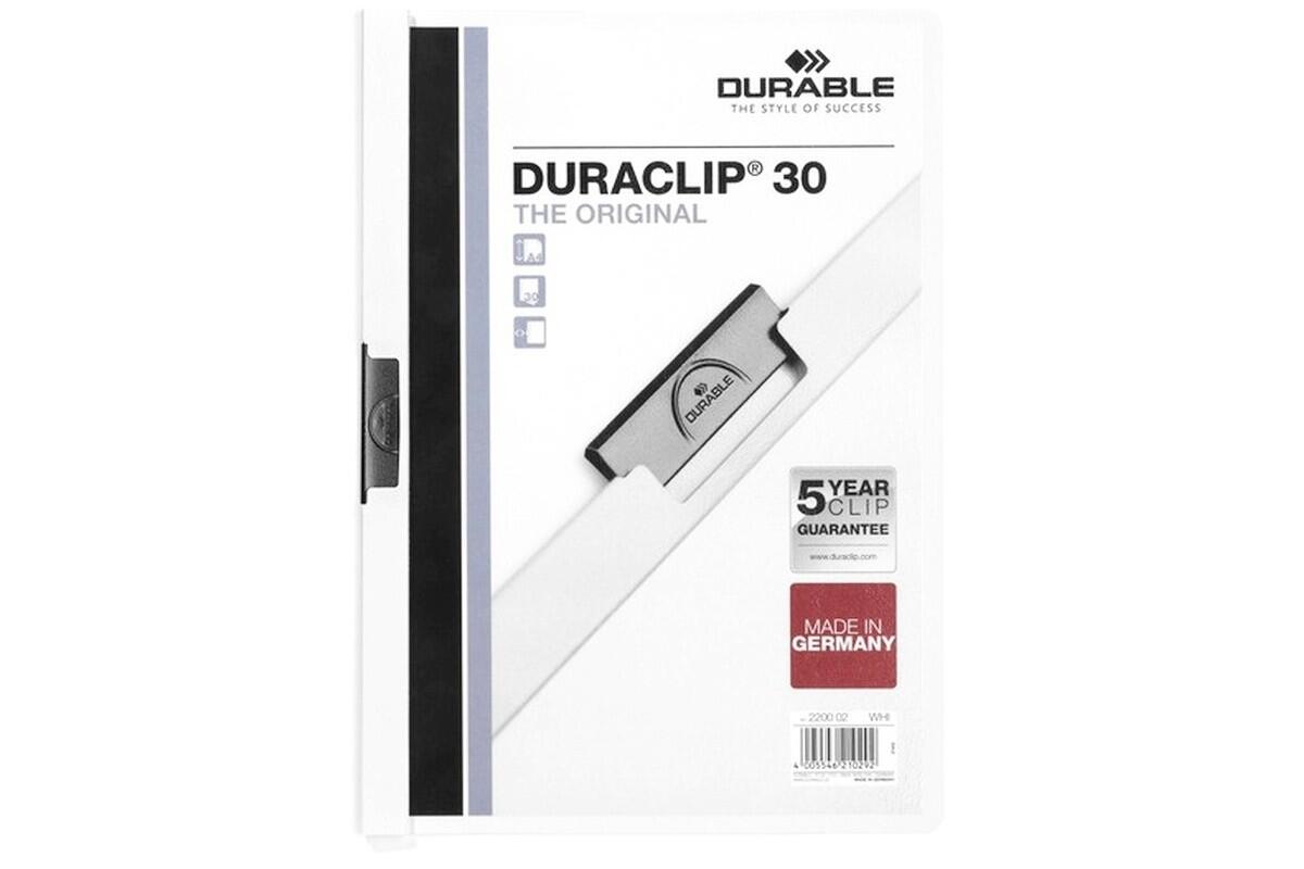 Desky A4 Durable DuraClip 2200, s kovovým klipem, 30 listů, bílé
