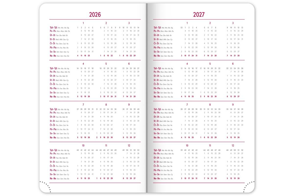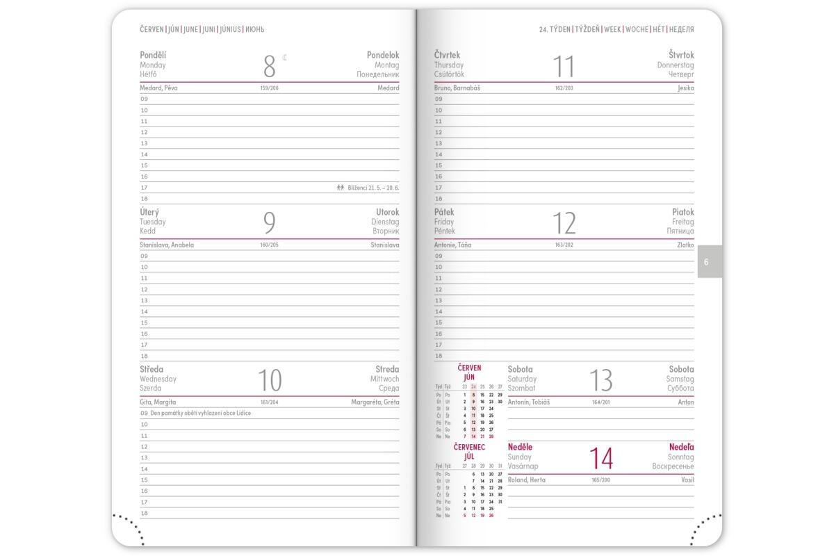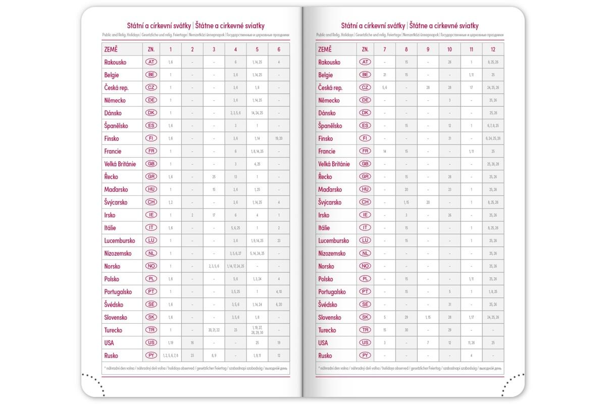 - 6jazyčné týdenní kapesní kalendárium: CZ, SK, EN, DE, HU, RU