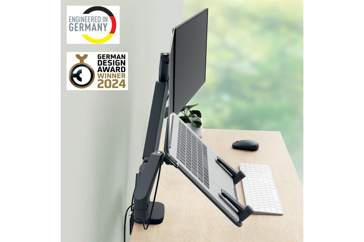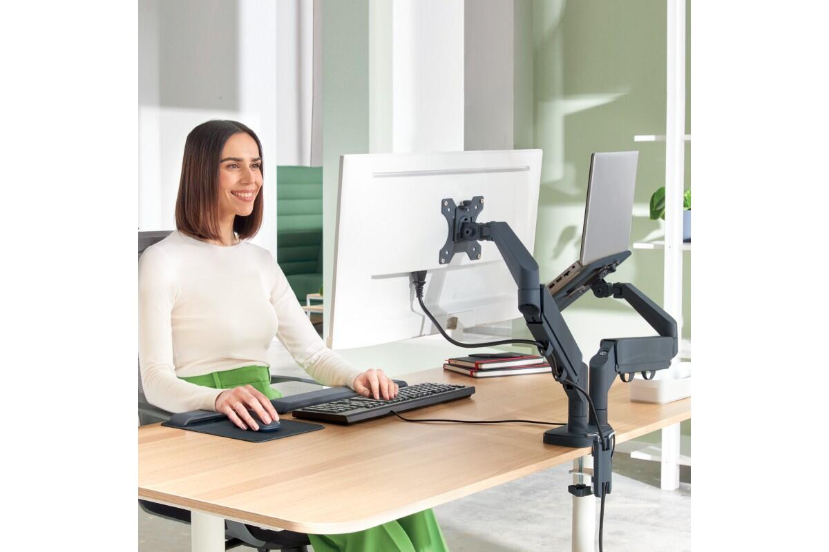 - ergonomické duální rameno pro monitor a notebook, které při správném nastavení výšky monitoru a notebooku zlepšuje držení těla, nastavení očí a pohodlí krku a ramen