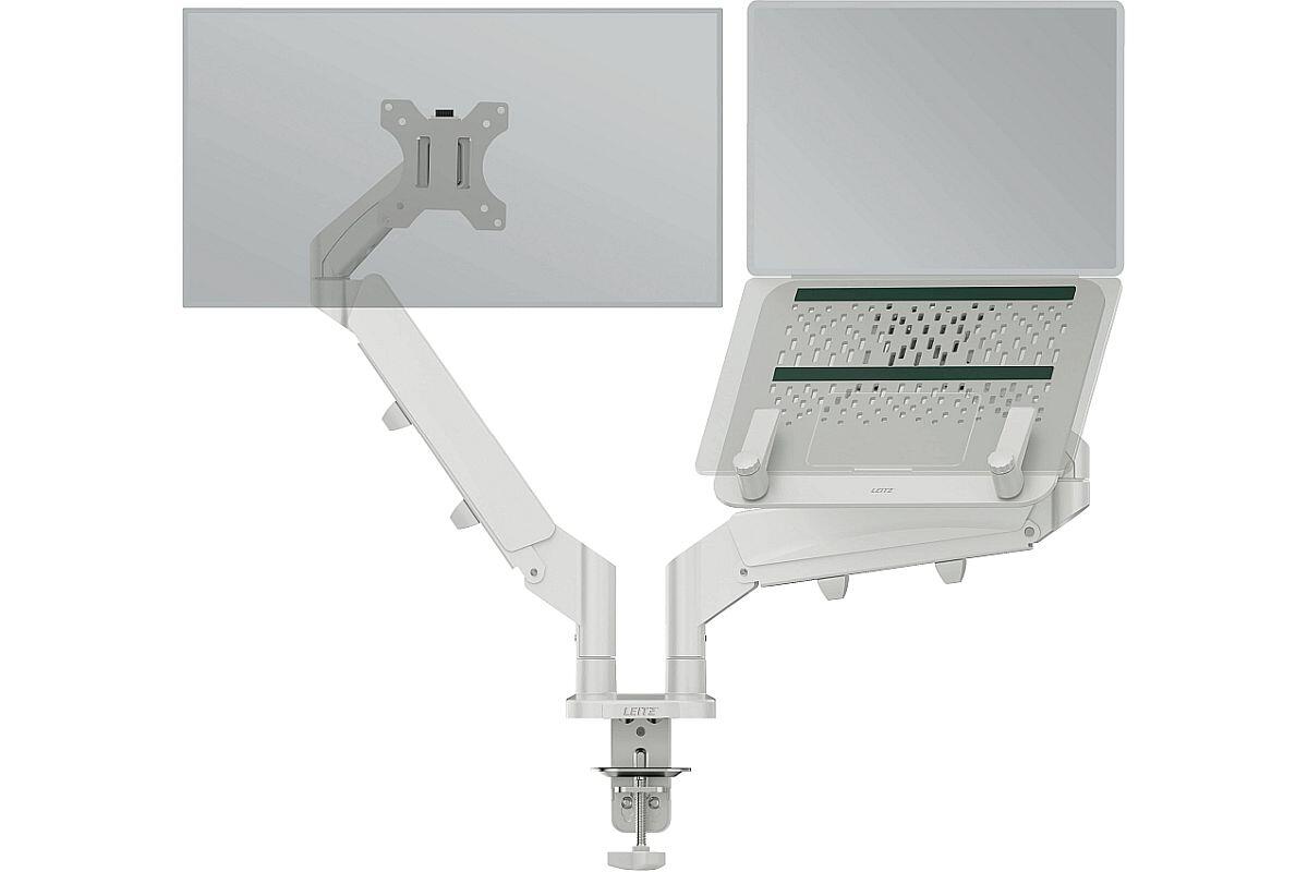 - ergonomické duální rameno zlepšuje držení těla a pohodlí při práci s monitorem a notebookem
