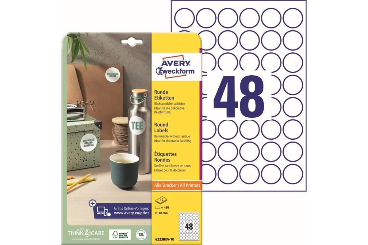 Etikety kulaté Avery Zweckform, průměr 30 mm, arch A4, snímatelné, 10 listů, bílé