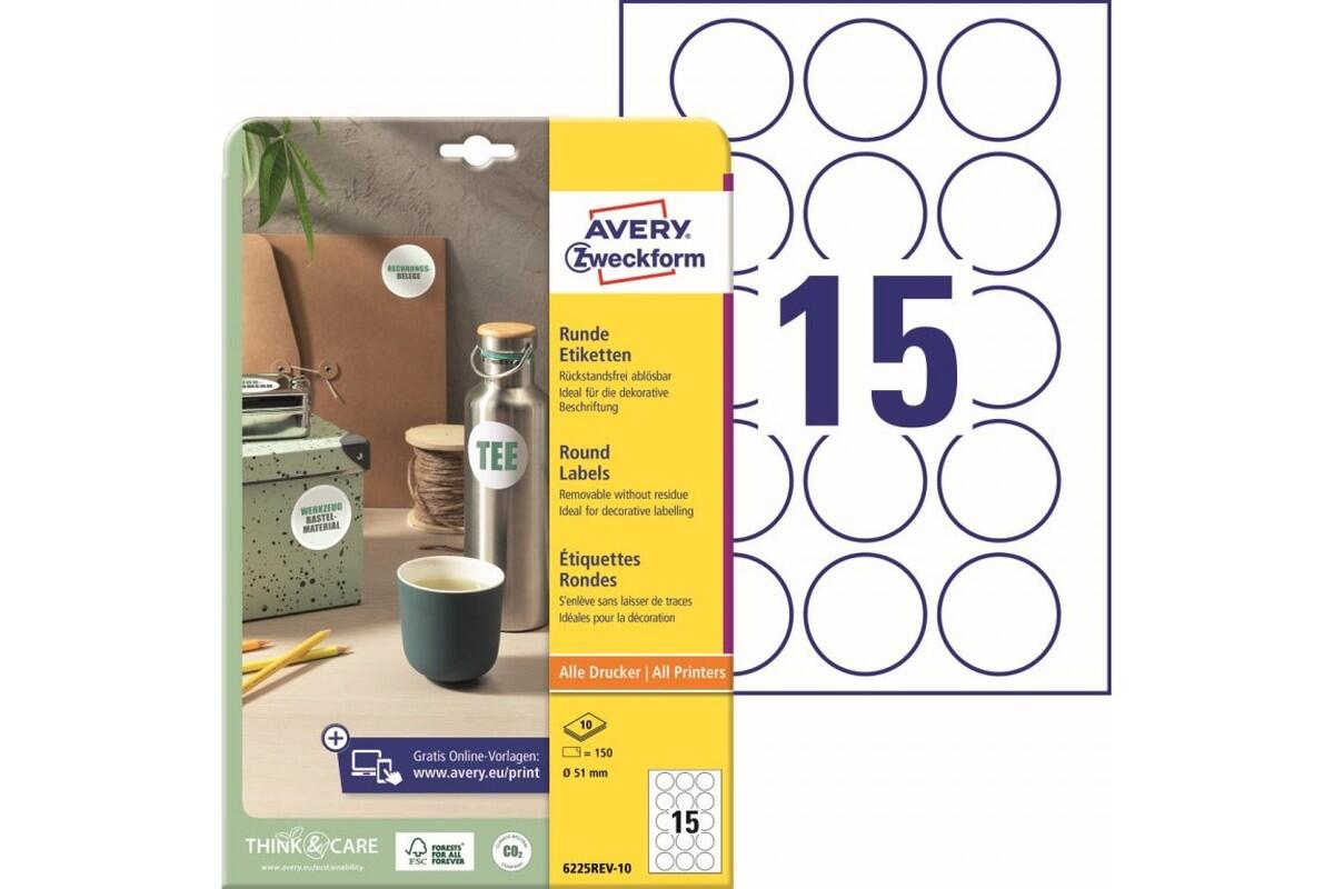 Etikety kulaté Avery Zweckform, průměr 51 mm, arch A4, snímatelné, 10 listů, bílé