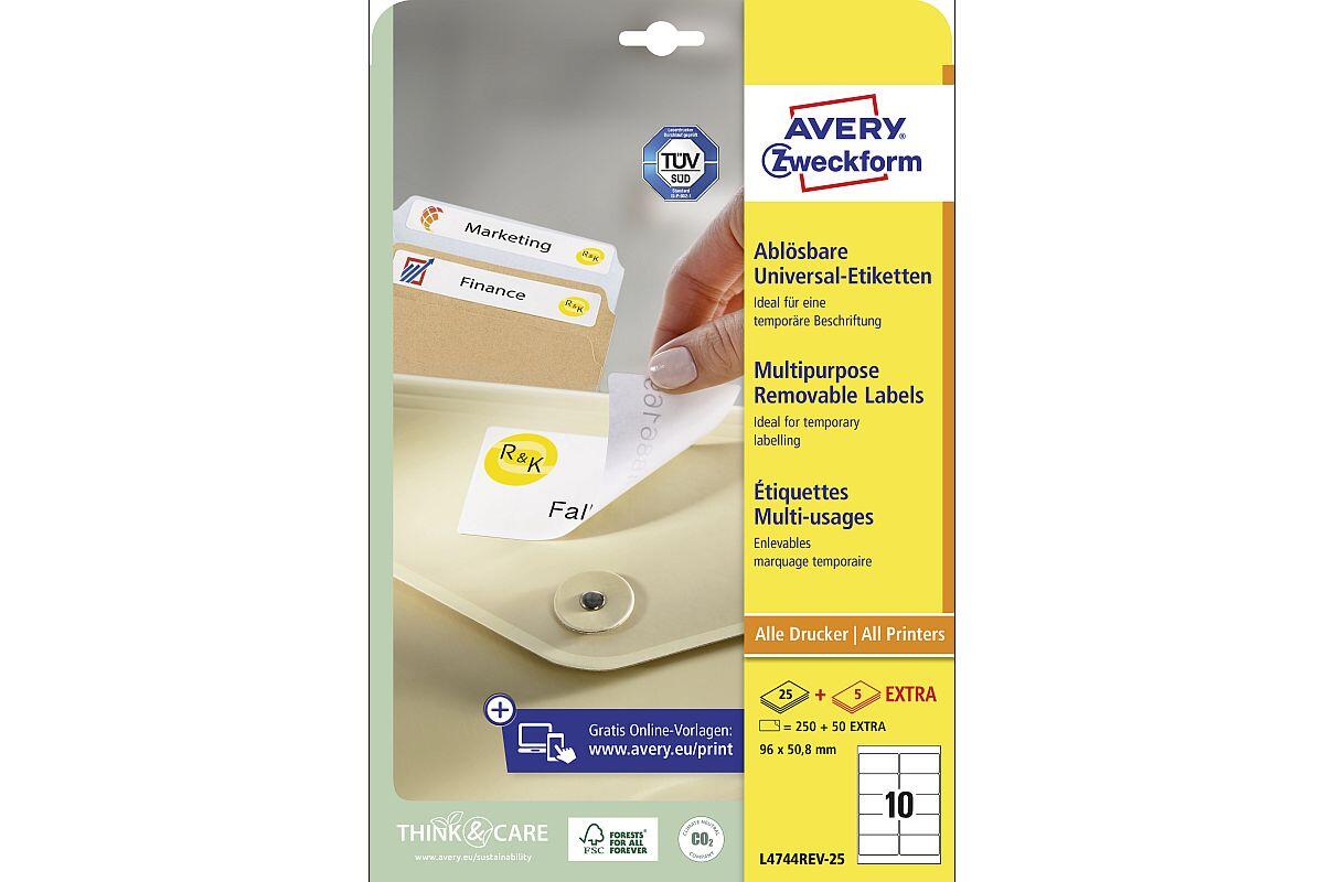 Etikety univerzální Avery Zweckform, 96 x 50,8 mm, arch A4, snímatelné, 25+5 listů, bílé