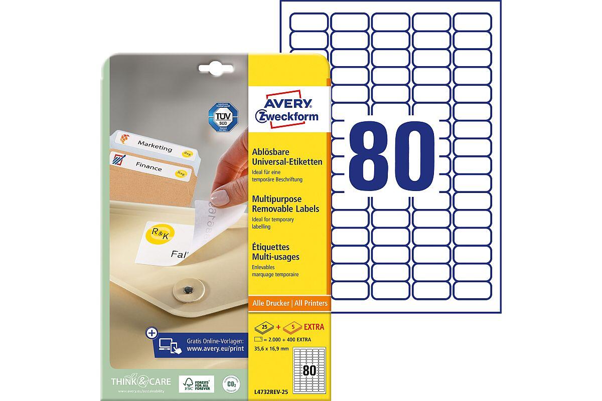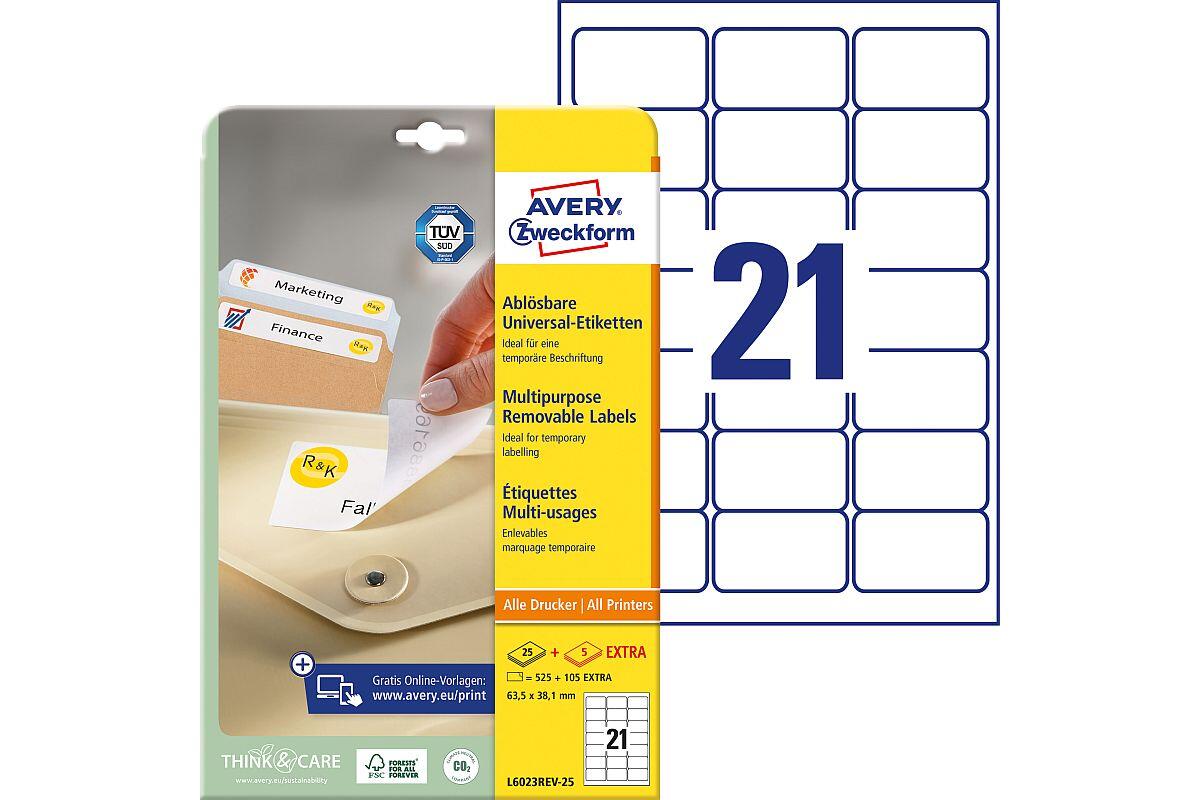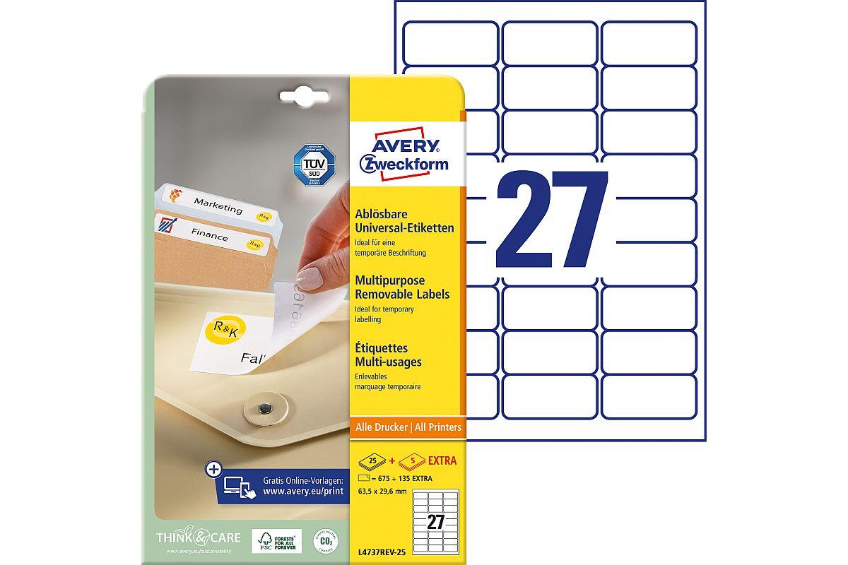 Etikety univerzální Avery Zweckform, arch A4, snímatelné, 25+5 listů, bílé