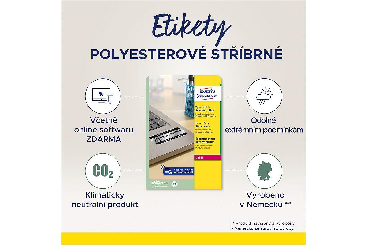 Etikety velmi odolné Avery Zweckform, 63,5 x 29,6 mm, arch A4, 20 listů, stříbrné