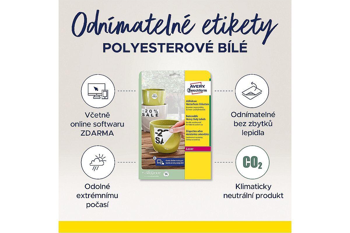 Etikety velmi odolné Avery Zweckform, 99,1 x 42,3 mm, arch A4, snímatelné, 20 listů, bílé