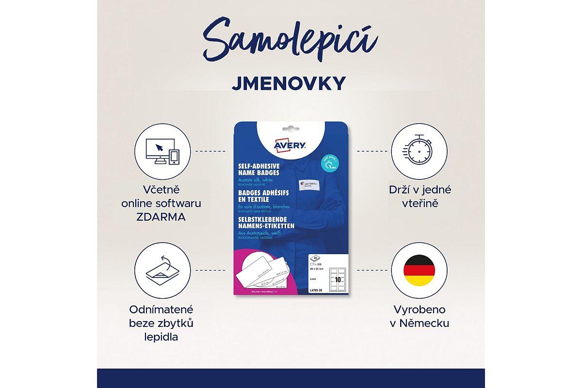 - pomocí bezplatné aplikace Avery® Design & Print jednoduše vytvoříte profesionální jmenovky – využijte prázdné šablony nebo hotové moderní designy, vložte text, vytiskněte a je hotovo
