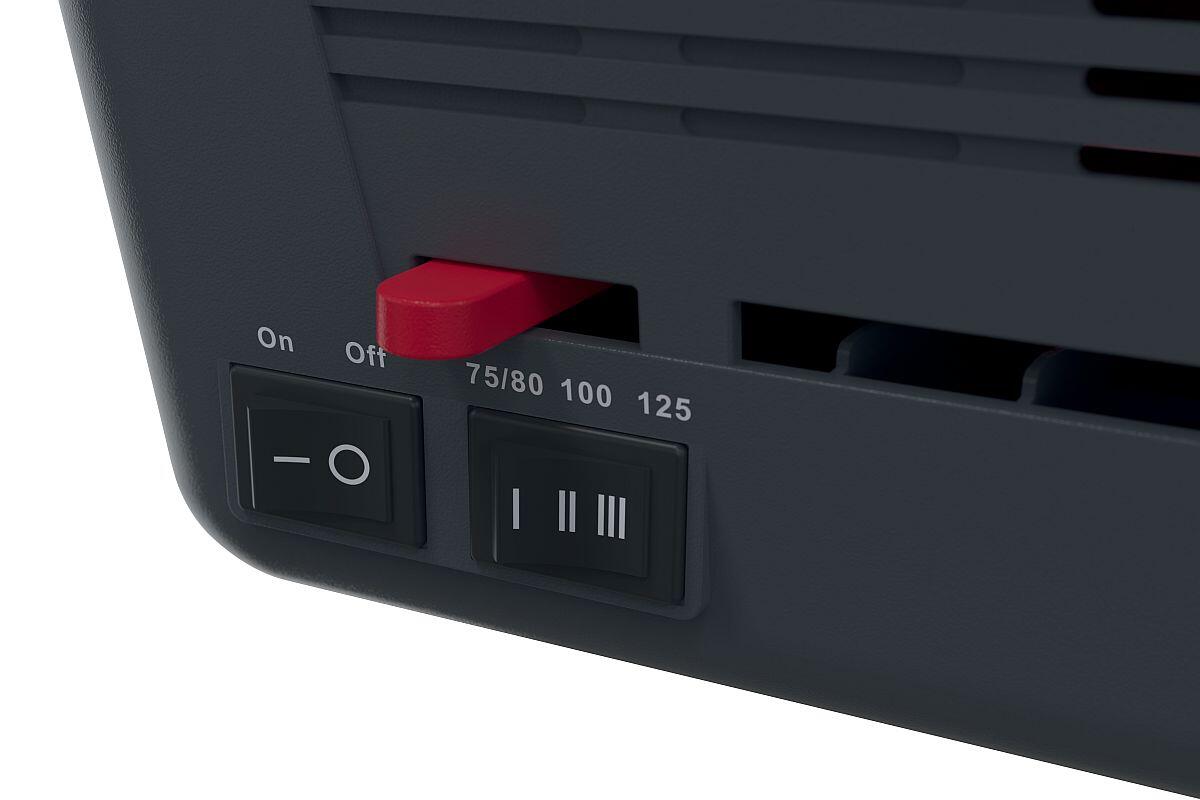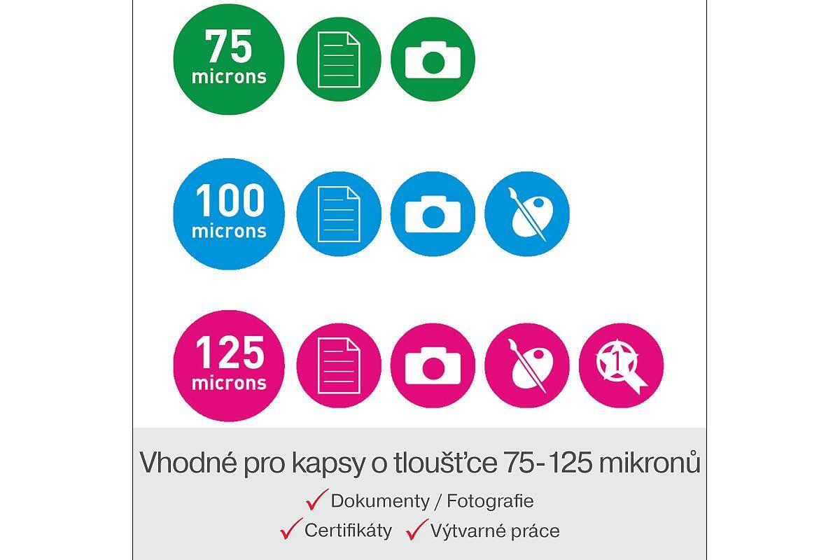 - snadno použitelný ovládací přepínač nabízí tři nastavení tloušťky laminovací kapsy v rozmezí 75-125 mikronů, což poskytuje flexibilitu pro různé typy dokumentů