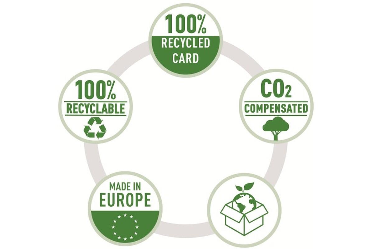 - 100% recyklovaný karton, neutrální uhlíková stopa, kompletně recyklovatelné, s ekologickou certifikací Blue Angel
