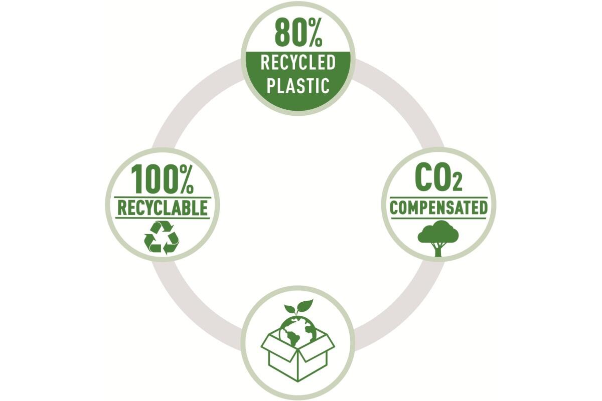 - vyrobeno z 80% recyklovaného (PCR) plastu, 100% recyklovatelné, CO2 neutrální, ekologická certifikace Blue Angel