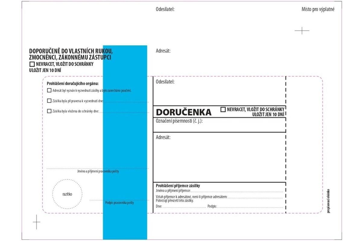 - doručenková obálka s modrým pruhem a krycí páskou pro doručení zásilek podle zákona 500/2004 Sb. (Správní řád)