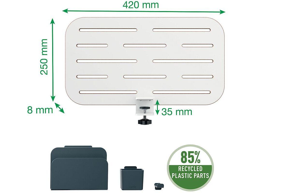 - součástí jsou tři doplňky na stůl, všechny vyrobené z 85 % z recyklovaného plastu: 1 x držák poznámkového bloku, 1 x držák pera a 1 háček na zavěšení pro sluchátka