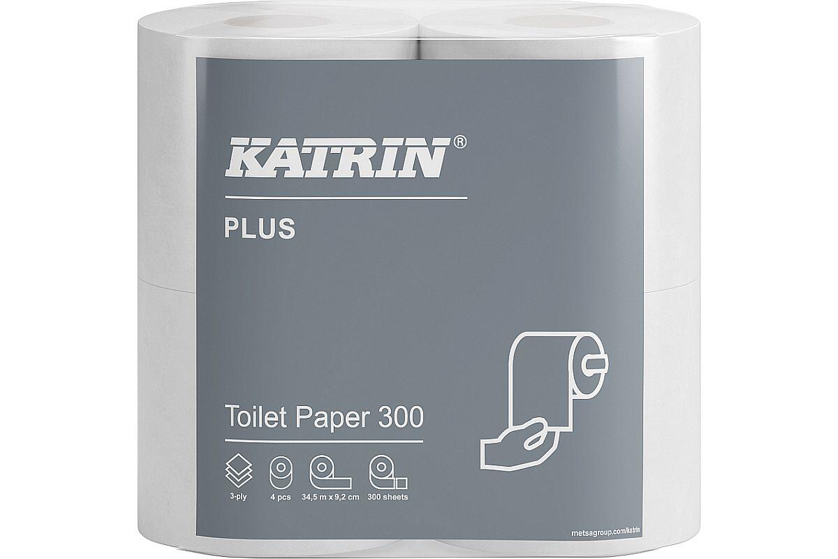 Papír toaletní Katrin Plus, 3vrstvý, celulóza, ø 12,5 cm, 34,5 m, 300 útržků, 4 ks, bílý (97388)