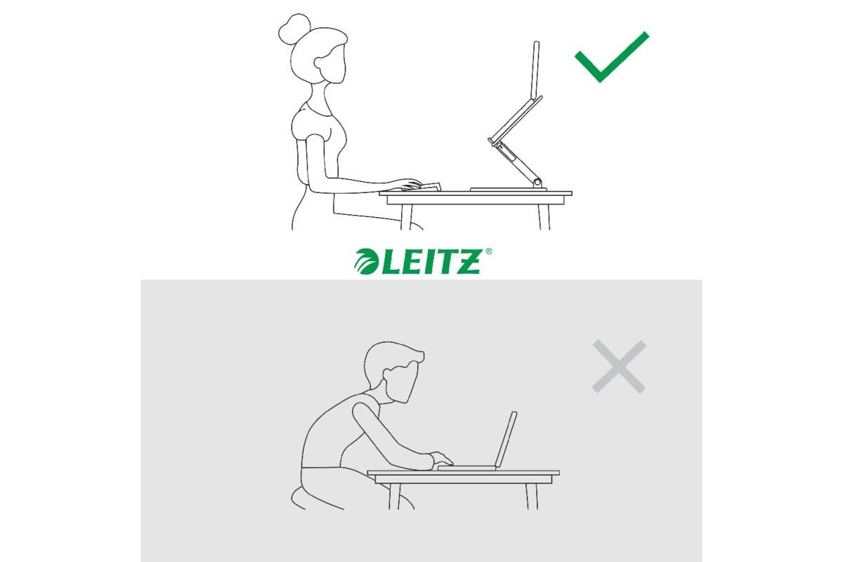- ergonomický víceúhlý stojan na notebook Leitz Ergo zvedá obrazovku notebooku do ideální ergonomické výšky, čímž zvyšuje pohodlí při sledování a pomáhá zlepšit držení těla