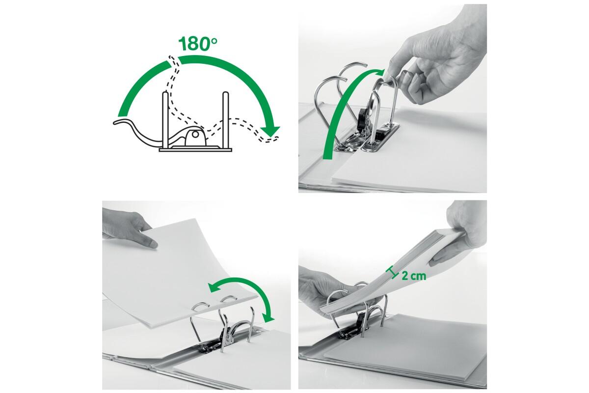 - unikátní patentovaná páková mechanika s otevřením o 180°, která umožňuje o 50 % širší otevření a o 20 % rychlejší práci s pořadačem