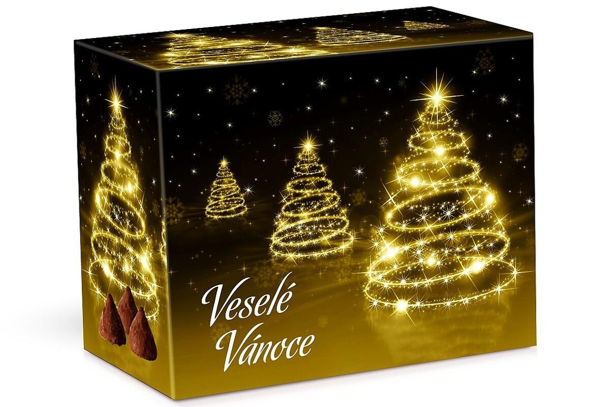 | 1913686 | Pralinky belgické, mléčné s čokoládovou náplní, 200 g, zlaté stromečky, Veselé Vánoce |