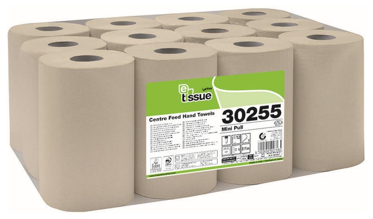 Ručník papírový na roli Celtex BIO E-Tissue Mini, 2vrstvý, recykl, středové odvíjení, průměr 13 cm, 250 útržků, 55 m, 12 ks, šedý