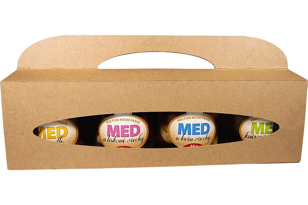 - med květový akátový 50 g, med a kešu ořechy 44 g, med a lískové ořechy 44 g, med květový nektarový 50 g