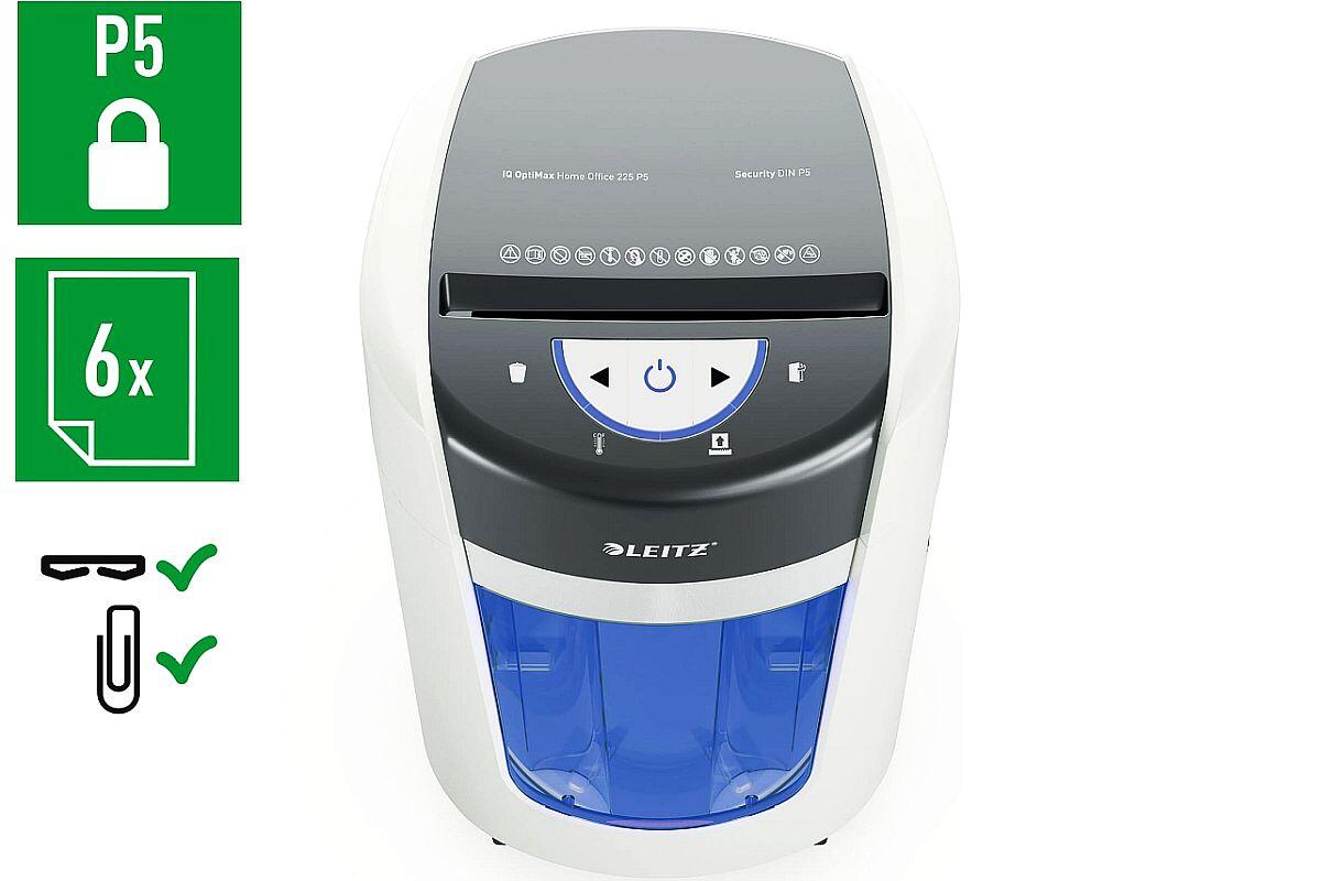 Skartovač Leitz IQ OptiMax 225, 2 x 15 mm, DIN P-5, 6 listů, 15 l, bílý