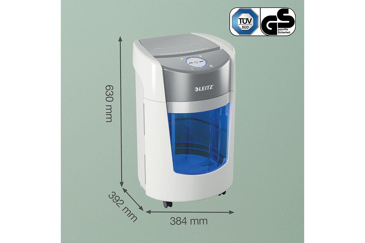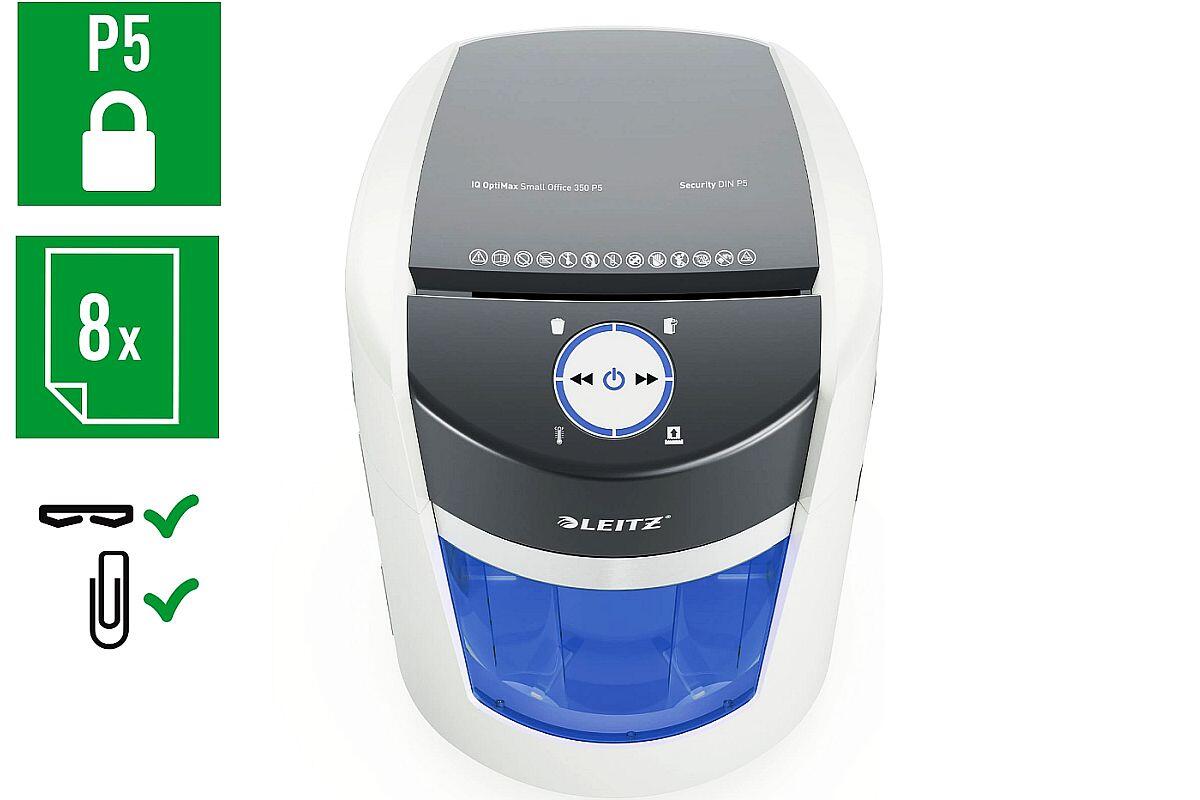 Skartovač Leitz IQ OptiMax 350, 2 x 15 mm, DIN P-5, 8 listů, 22 l, bílý