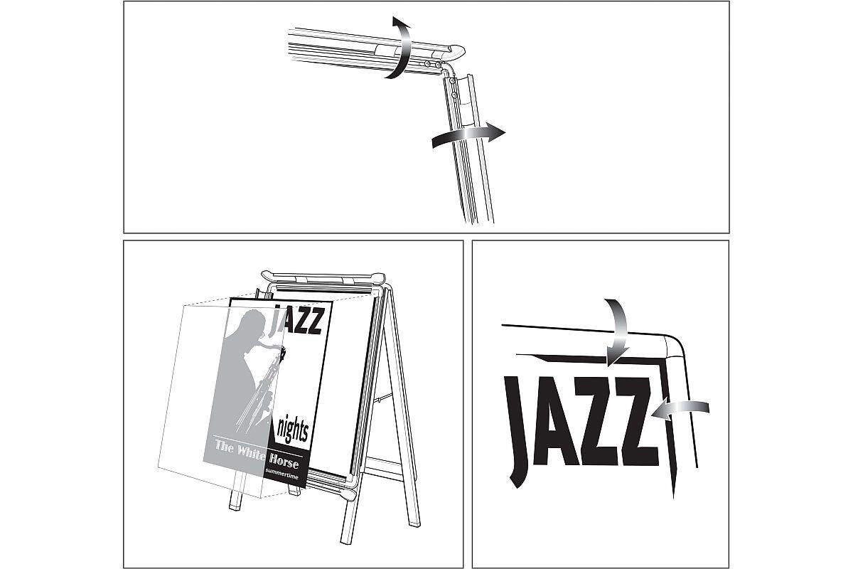 - reklamní stojan typu A s clip rámem se snadno používá a umožní vystavovat plakáty a informace chráněné proti vlivům počasí