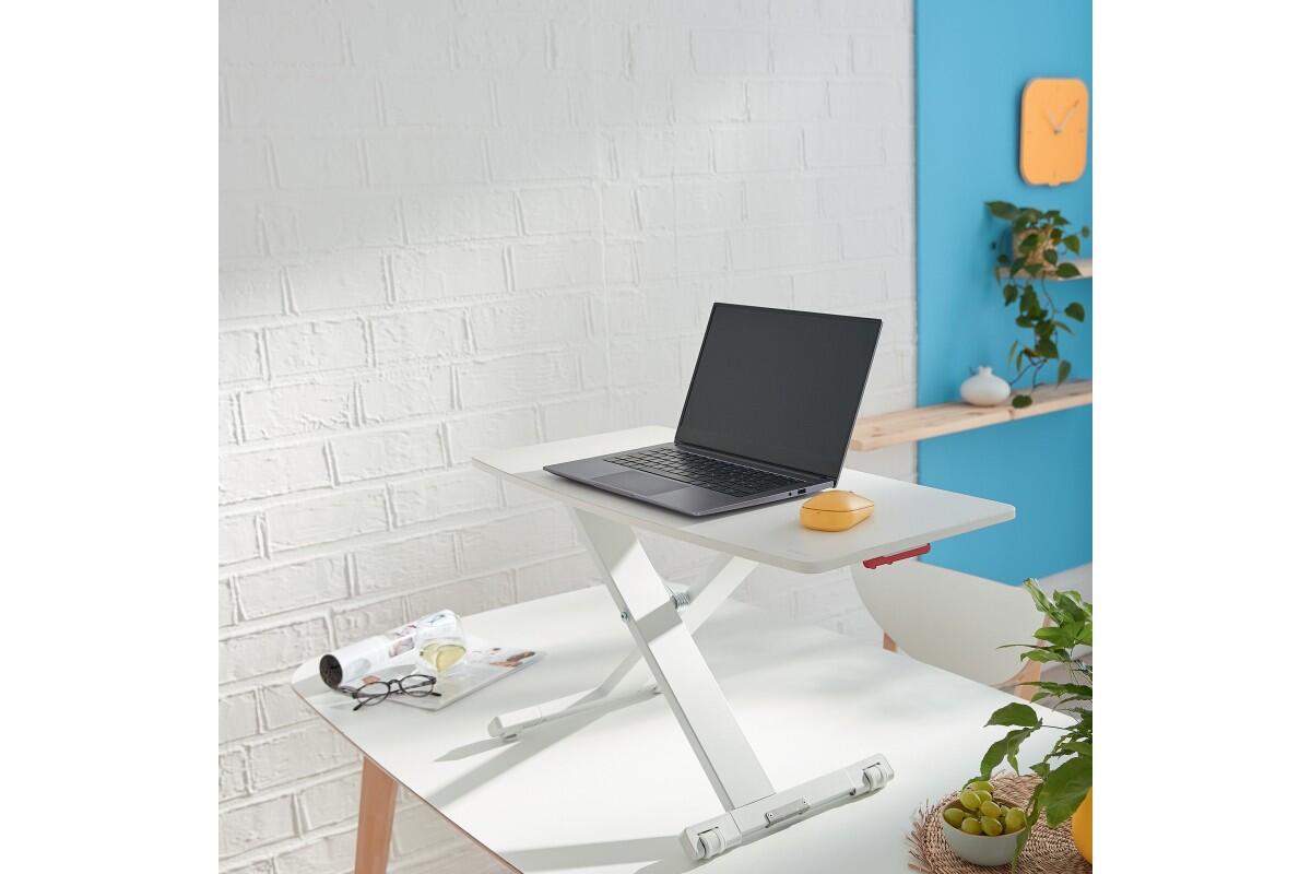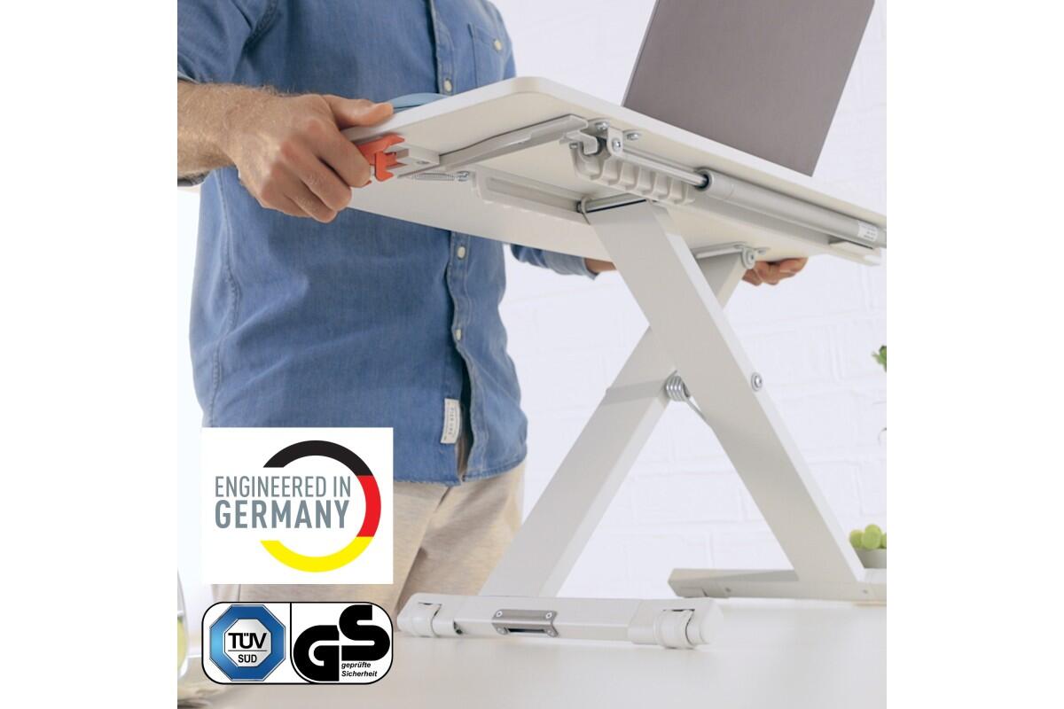 - tento "stůl na stůl" rychle nastavíte do požadované výšky a z jakéhokoli běžného stolu tak uděláte mobilní pracovní prostor, který se snadno přizpůsobí a přitom zůstává pevný a stabilní v jakékoli výšce
