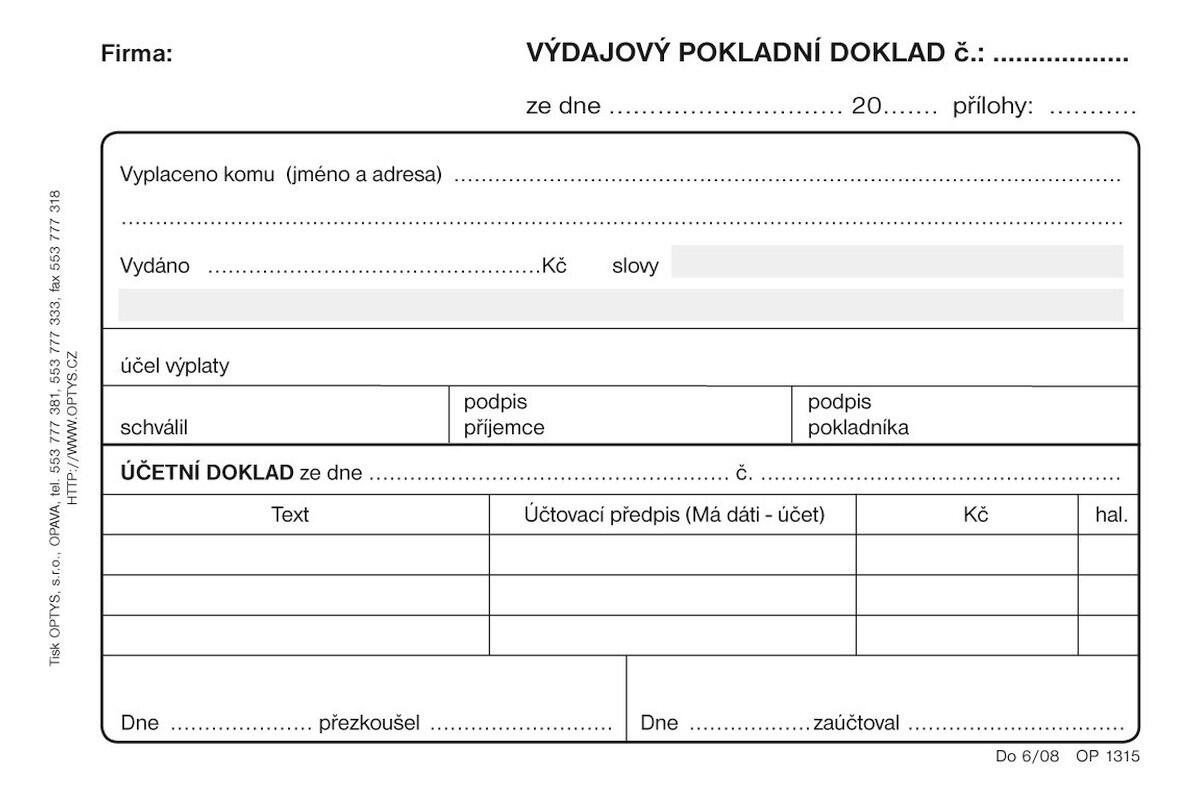 Tiskopis Výdajový pokladní doklad pro podvojné účetnictví Optys, A6, samopropisovací, 50 listů