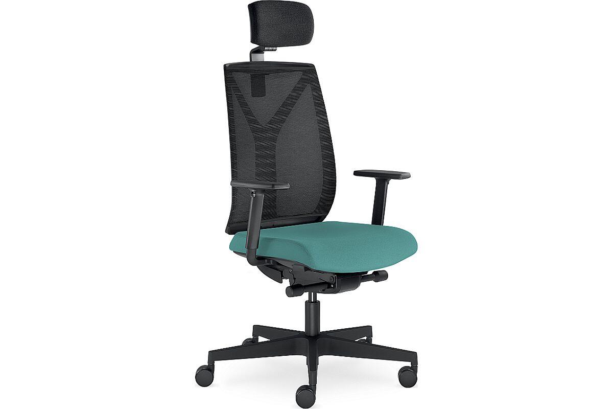 Židle kancelářská Leaf 503-SYB, hlavová opěrka, výškově stavitelný opěrák, bederní opěrka, područky BR-207, posuv sedáku, hlavová opěrka ON8033 černá, opěrák síť RIB11 černá, sedák ON7504 modrozelená