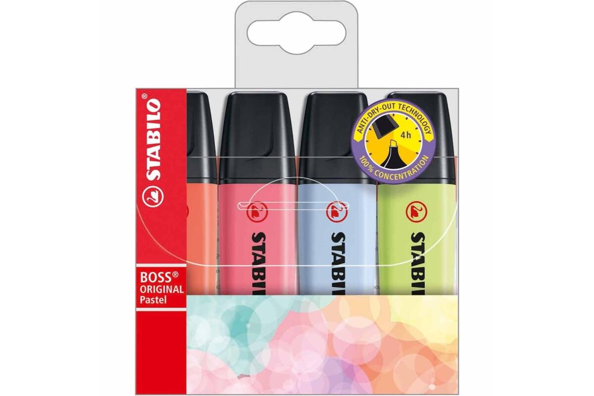 | 2465698 | Zvýrazňovač Stabilo Boss Original Pastel, 2-5 mm, klínový hrot, 4 ks (pastelová oranžová, svěží modrá, fuchsiová, šedivá) |